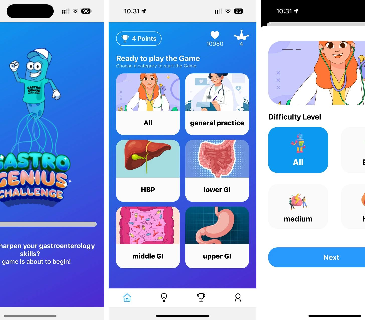 Una evolución del GastroGenius Challenge, GastroGenius Pro es una app de aprendizaje médico gamificada, centrada en la gastroenterología clínica, que va más allá del quiz. Integra simulación de casos reales, escenarios virtuales de diagnóstico y análisis personalizado del rendimiento.